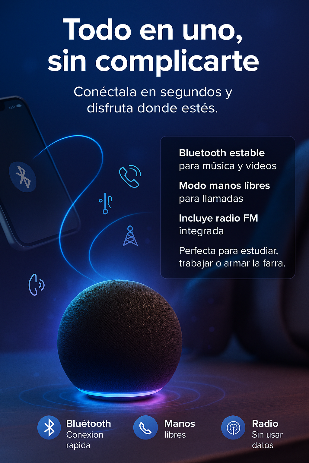 BoomBall integra Bluetooth, radio FM y manos libres en un solo dispositivo. Eso significa menos aparatos, menos cables y más orden. Puedes trabajar o estudiar mientras escuchas tu emisora favorita y responder llamadas sin levantar el celular. Este tipo de soluciones “todo en uno” son recomendadas para quienes buscan practicidad sin sacrificar funcionalidad.