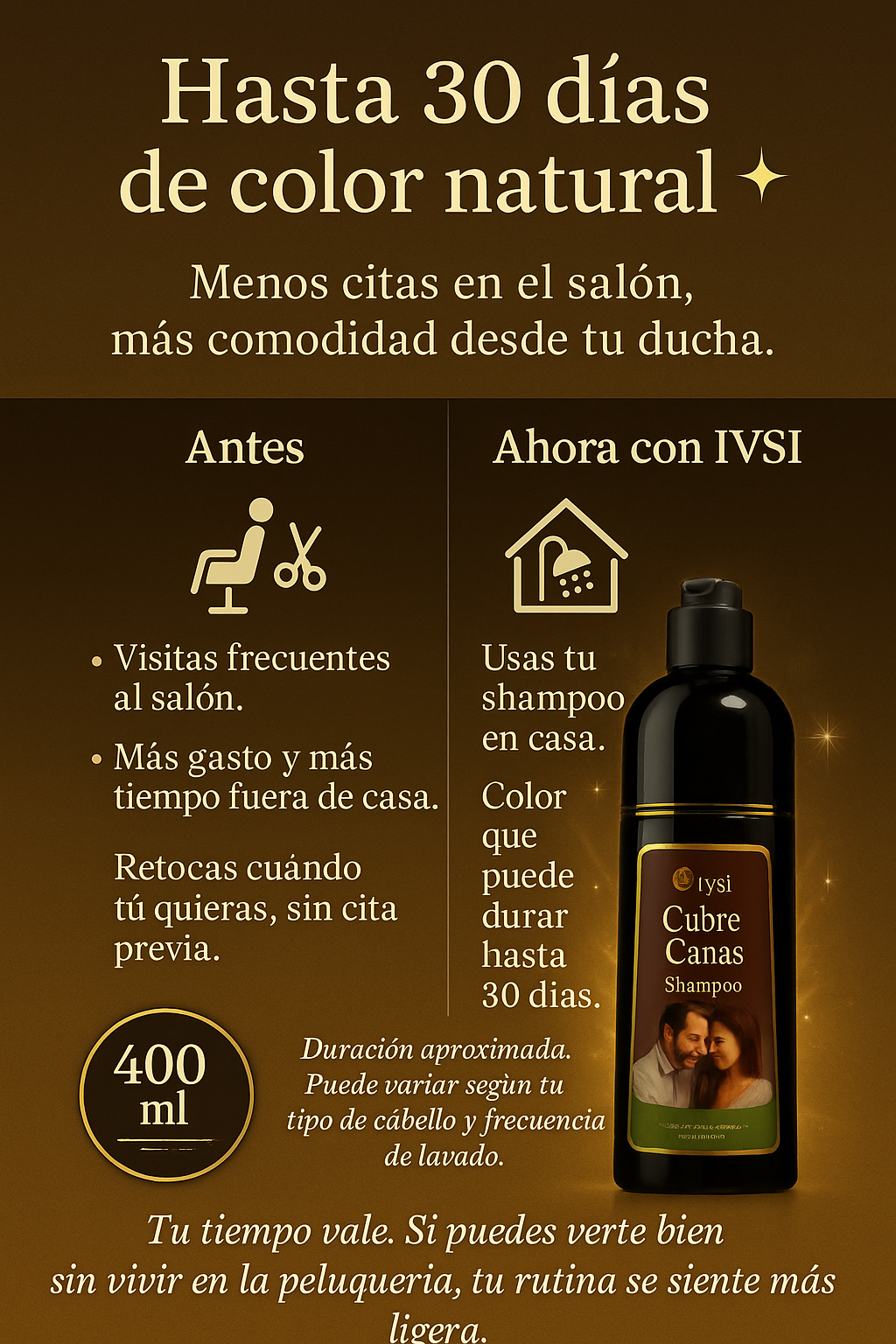 Es un shampoo con color que, al aplicarse sobre el cabello húmedo, ayuda a cubrir las canas y unificar el tono. La fórmula se adhiere a la fibra capilar durante algunos minutos y, al enjuagar, deja un color más uniforme y notorio.