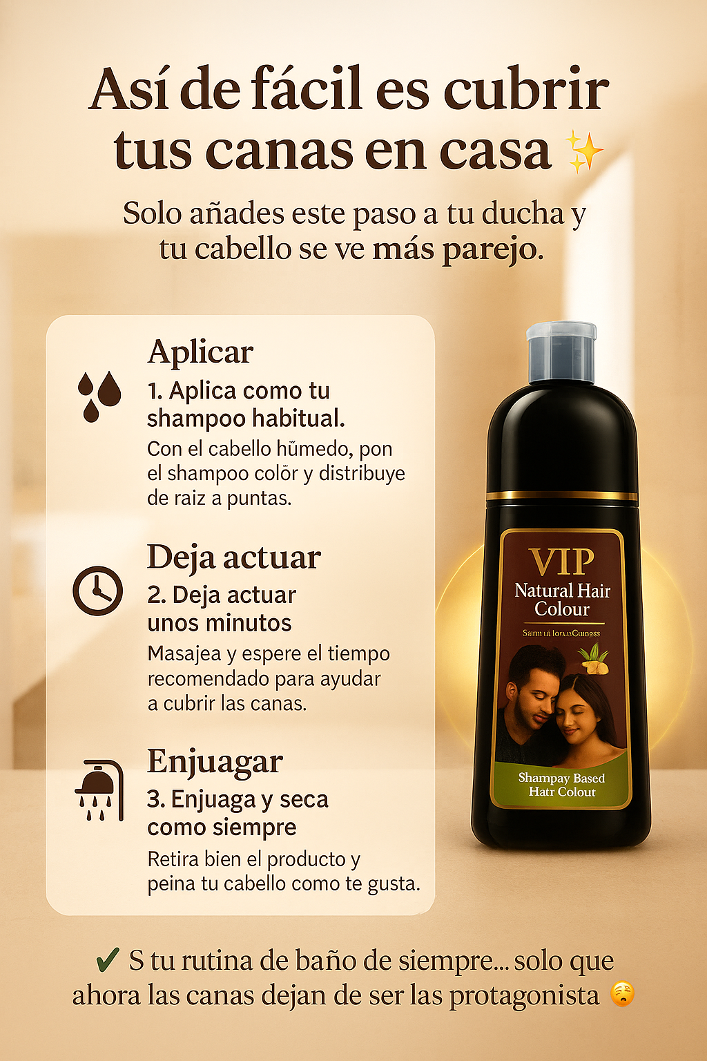 No necesitas experiencia previa ni horas de salón. Lo aplicas en la ducha como tu shampoo habitual, sigues las indicaciones del envase, dejas actuar el tiempo recomendado y enjuagas. Es perfecto para agendas ocupadas y personas que prefieren resolver todo en casa.